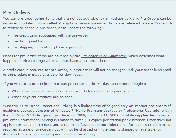 Le site Microsoft Store US propose d’ores et déjà l’offre de pré-commande Windows 7, puisqu’aux Etats-Unis, l’offre est limitée du 26 juin au 11 juillet 2009.